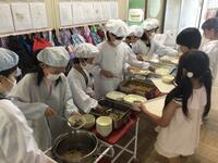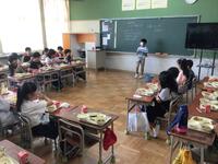 給食時間に、落ち着いて準備して食べている子供たちです。
