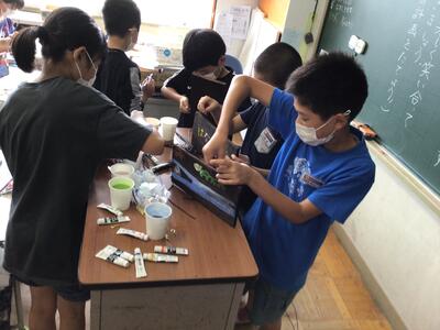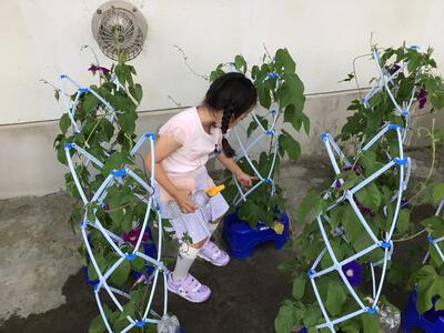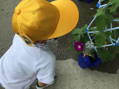 1年生が大切に育てているアサガオが,きれいな花を咲かせました!ブルーの花,濃い紫の花,薄い紫の花と色とりどりのきれいな花が咲いています。つぼみもたくさんついています。1年生は,毎朝,アサガオの花が何個咲いたか,担任の先生にうれしそうに話しています。